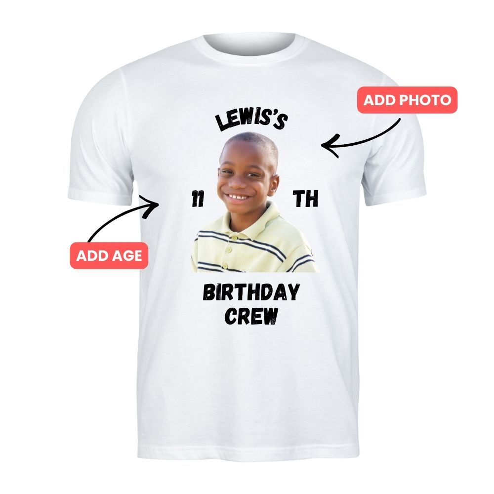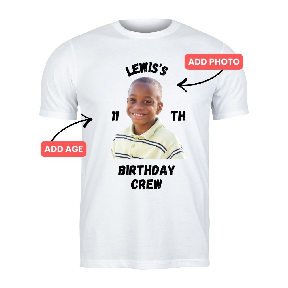 Transform your birthday celebration into something truly special with our customisable Birthday Crew T-Shirt! Each shirt is uniquely designed with your chosen photo, name, and age, creating the perfect matching outfit for the whole family to wear on the big day. Whether it's a milestone birthday or a casual celebration, these personalised tees bring everyone together in style. Watch the birthday boy or girl's face light up when they see themselves featured on their very own birthday shirt. Perfect for photos, parties, and creating lasting memories that your family will treasure for years to come.