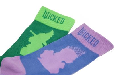 A pair of cozy socks featuring Wicked-themed design motifs, tied to both witches.