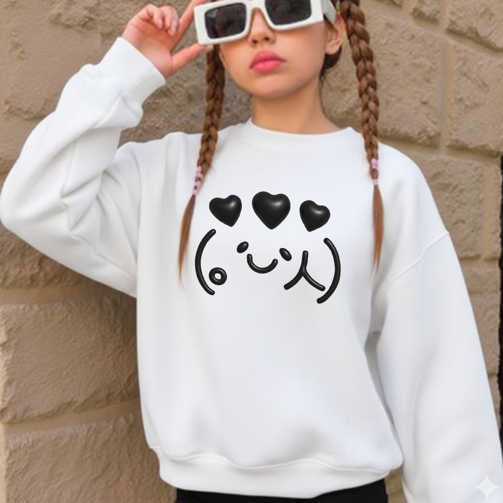 This on-trend piece features adorable kaomoji-inspired designs that bring playful character to any wardrobe. Perfect for kids and young adults seeking that cute, Japanese-influenced style, this sweatshirt combines comfort with contemporary fashion sensibility. The soft fabric and charming graphics make it an essential addition to this season's collection for anyone passionate about kawaii culture and expressive, fun fashion choices.