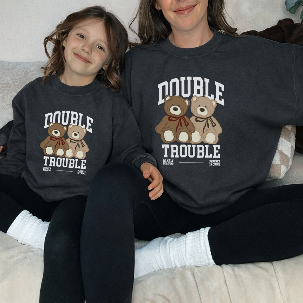 For the perfect duo. What's better than one ... two! The ultimate besties matching sweatshirts. Featuring graphic slogan 'Double Trouble' with our adorable bear graphics. This coquette style sweatshirts are a must have for your a your mini.