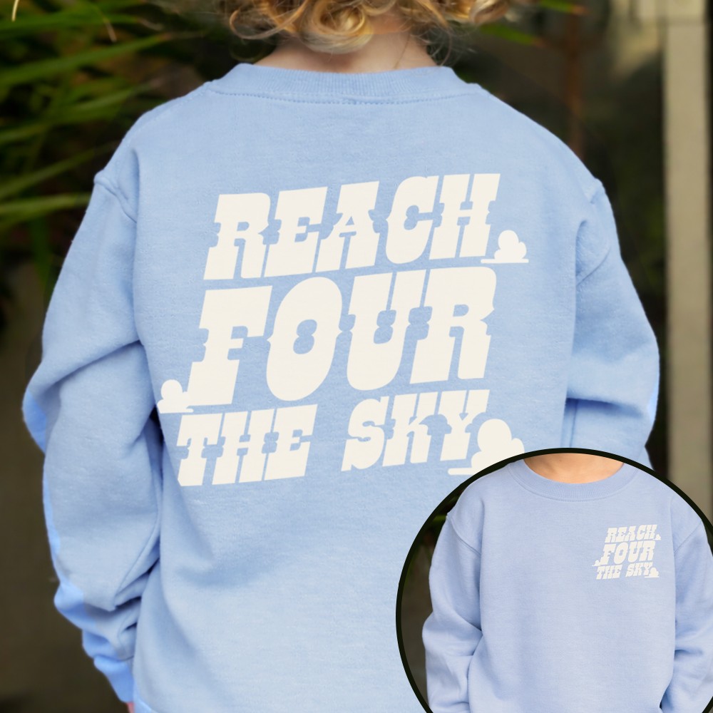 The perfect sweatshirt for the little one turning 4! Featuring graphic front & back slogan 'Reach four the Sky' is cute yet stylish for all those kids that love the magic.